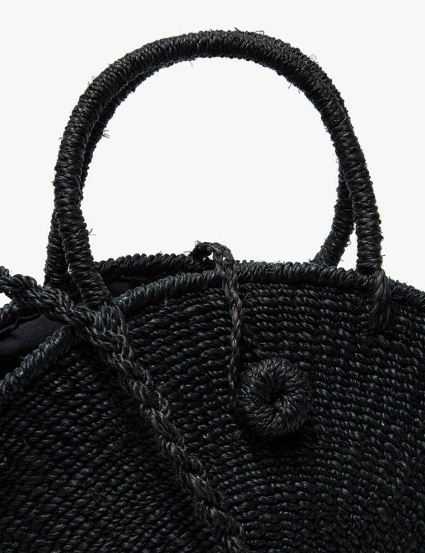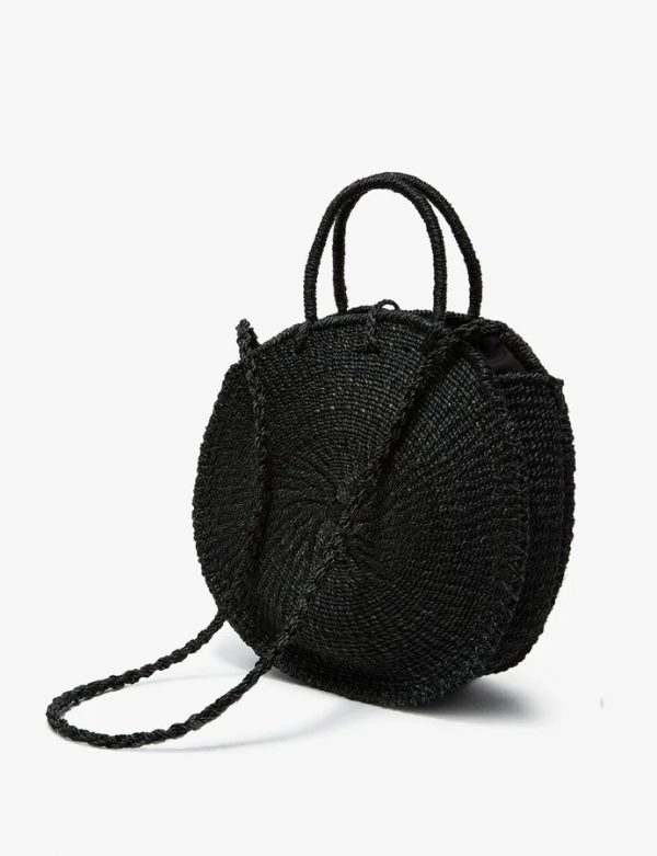 Túi dệt tròn từ Abacá màu đen. Dây đeo vai. Hai tay cầm trên cùng. Nút đóng và vòng lặp. Nội thất đay với da thương hiệu …